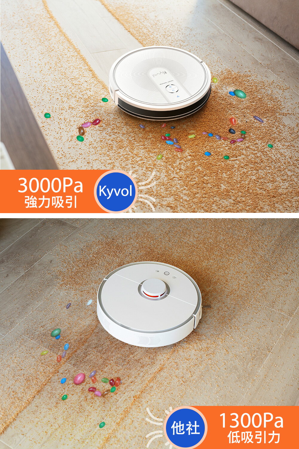 商品 Kyvol ロボット掃除機 E31 サイズ 325*324*70mm 重さ 2.7KG 静音モード 600PA 標準モード 1000PA 強力モード 3000PA バッテリー 3200mAh 充電時間 5~6h 消費電力(機体) 28W 動作電圧 (充電ベース) 100〜240V パッキングリスト ·電源アダプタ(充電台用)*1 ·充電台*1 ·リモコン*1 ·リモコン用単4形電池*2 ·清掃ツール*1 ·サイドブラシ*4 ·HEPA式用フィルターセット*1 ·磁気ストライプ(6.6フィート/2m)*1 ·3M製テープ*12 ·説明書 *1 ·Kyvolアプリご利用ガイド *1 ·クイックガイド *1 保証期間 2年間保証 Kyvolは、ロボット掃除機や加湿器など革新的で高品質スマート家電を製造しています。