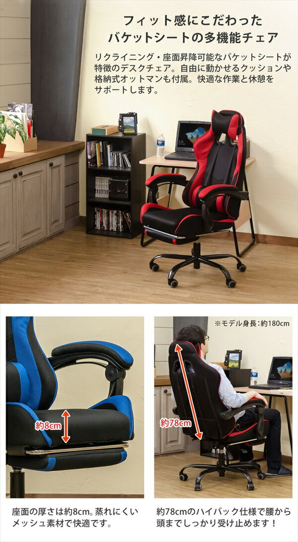 ◆メッシュ張りの快適バケットシートのフルフラットメッシュレーシングチェア◆ 背中から頭までしっかり支えるハイバックの高機能チェアです。