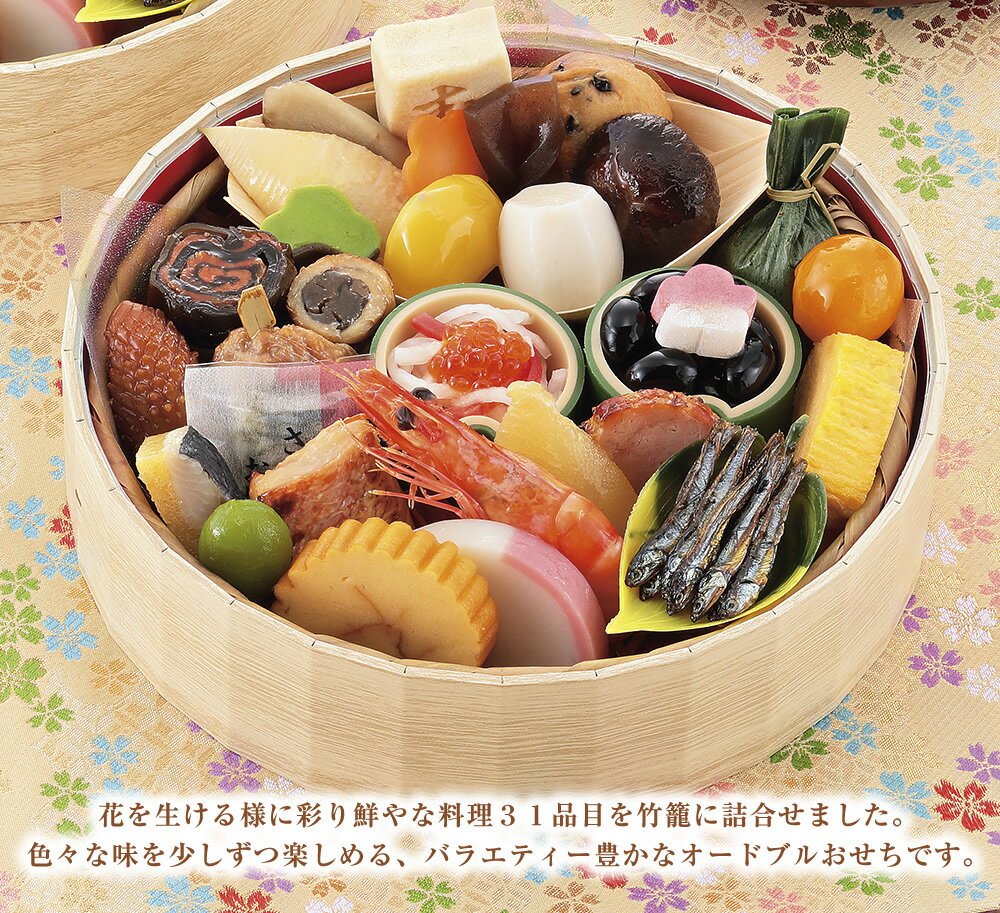 商品説明 花を生ける様に彩り鮮やな料理31品目を竹籠に詰合せました。