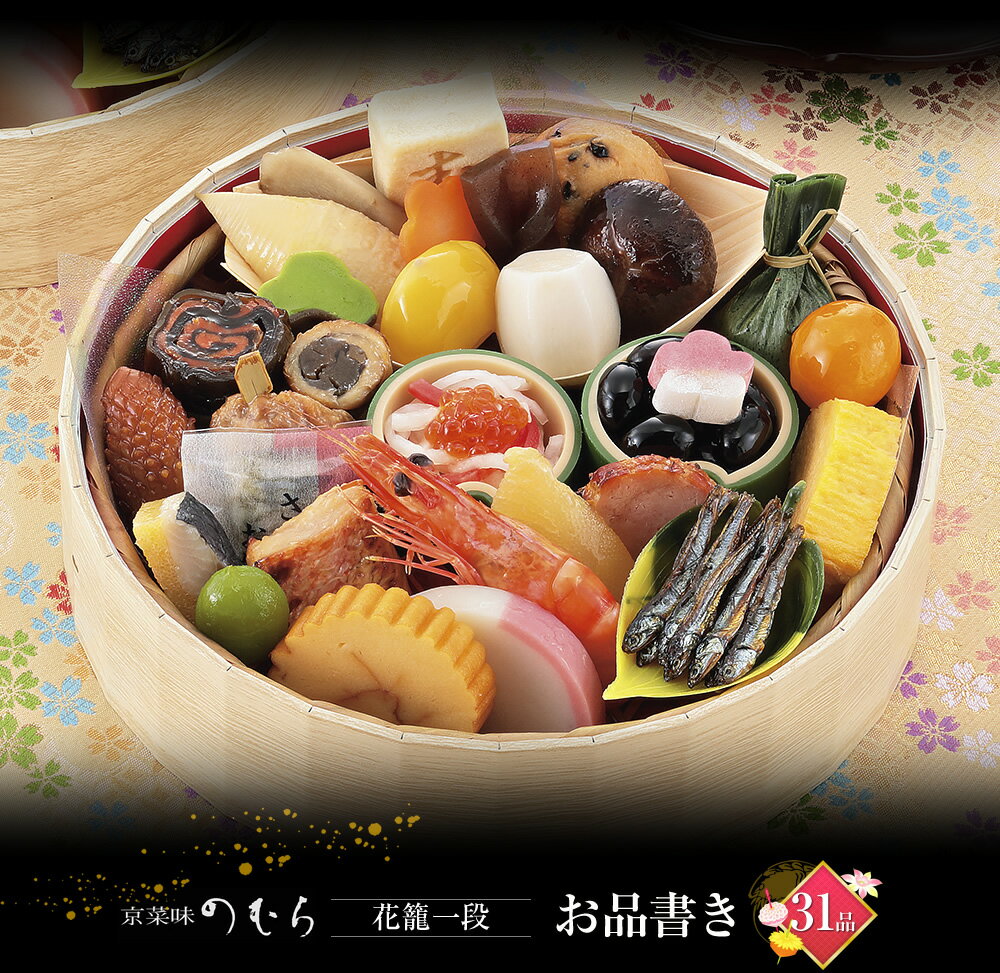名称 京菜味のむら おせち「花籠一段」 内容量 1人前 31品、約216×55mm 内容 黒豆 25g 梅餅 1個 金時人参入り生酢 25g いくら 3g 鮭昆布なると巻 1切 穴子八幡巻 1切 合鴨つくね串 1本 松笠いか 1個 さごしのおぼろ包み 1個 赤魚西京焼 1切 お祝い海老 1尾 紅白蒲鉾 1切 伊達巻 1切 笹団子 1個 だし巻 1切 黒糖ローストポーク 1切 数の子 1切 黄金にしん 1切 田作り 6g 栗甘露煮 1個 黒豆がんも含め煮 1個 六角里芋煮 1個 手綱こんにゃく 1個 寿高野含め煮 1個 椎茸旨煮 1個 ごぼう煮〆 1個 筍煮〆 1個 松麩 1個 梅型人参 1個 若桃甘露煮 1個 金柑甘露煮 1個 賞味期限 冷凍状態で2020.1.31 保存方法 冷凍 原材料・アレルギー 一覧表はこちら 販売者 株式会社ノムラフーズ 京都府京都市伏見区 下鳥羽西芹川町66